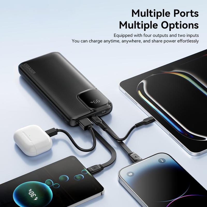 La banque d'alimentation numérique ESSAGER combine une forte performance de charge, deux câbles intégrés et un affichage LED clair du pourcentage dans un design compact et fiable - parfait pour les utilisateurs qui veulent une solution tout-en-un sans avoir à transporter des extras.