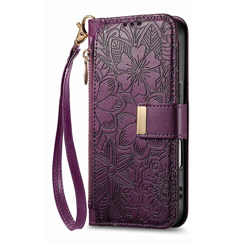 Etui portefeuille à motifs floraux et de feuilles avec pochette zippée et dragonne pour iPhone 16