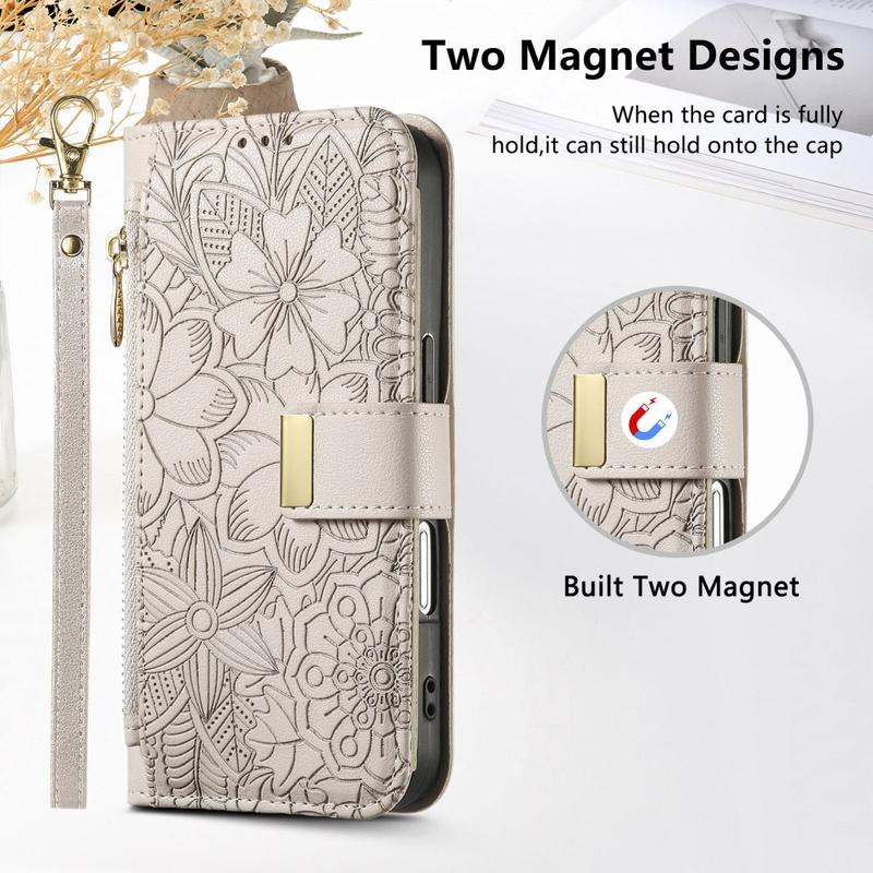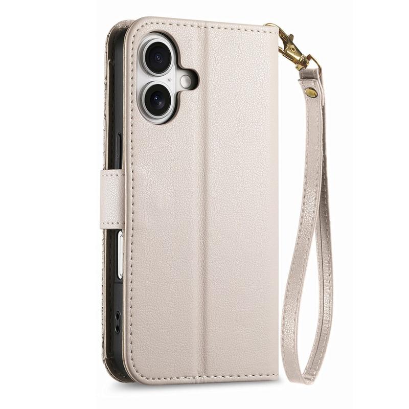• Etui portefeuille à motifs floraux et de feuilles avec pochette zippée et dragonne pour iPhone 17
