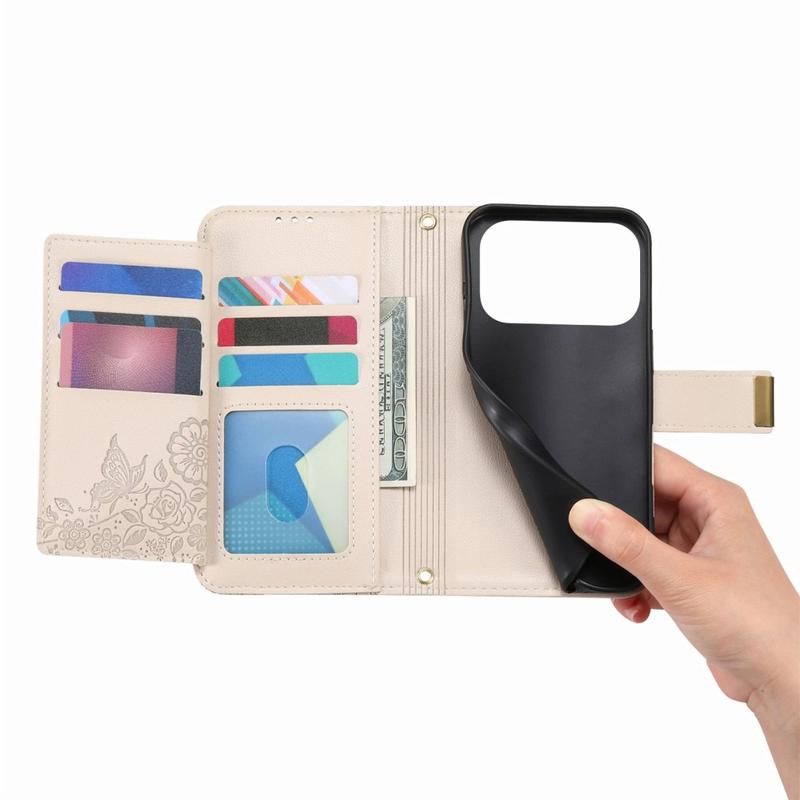 Les étuis portefeuille sont devenus de plus en plus populaires en tant qu'alternative écologique au port d'un portefeuille et d'un étui pour l'iPhone 17 Pro Max. Le processus de gaufrage floral n'améliore pas seulement l'apparence, mais renforce également la surface en polyuréthane, ce qui la rend plus durable contre les rayures.