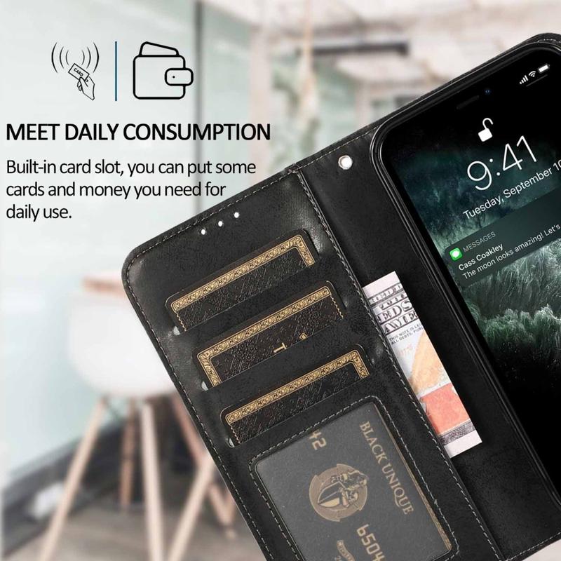 Fabriqué en polyuréthane mat rétro avec une coque intérieure en TPU souple, cet étui offre un toucher agréable et une protection fiable contre les rayures, les chocs et l'usure quotidiens. Le portefeuille intégré comprend 3 emplacements pour cartes et un compartiment à billets, ce qui vous permet de transporter facilement vos essentiels en un seul endroit. La conception pliable fait également office de support, vous offrant un angle de vision plus confortable en mode mains libres pour regarder des vidéos, naviguer sur Internet ou passer des appels.