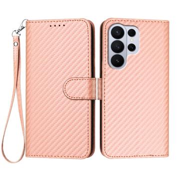 Etui portefeuille premium Samsung Galaxy S26 Ultra avec sangle - Texture fibre de carbone - Rose carbone
