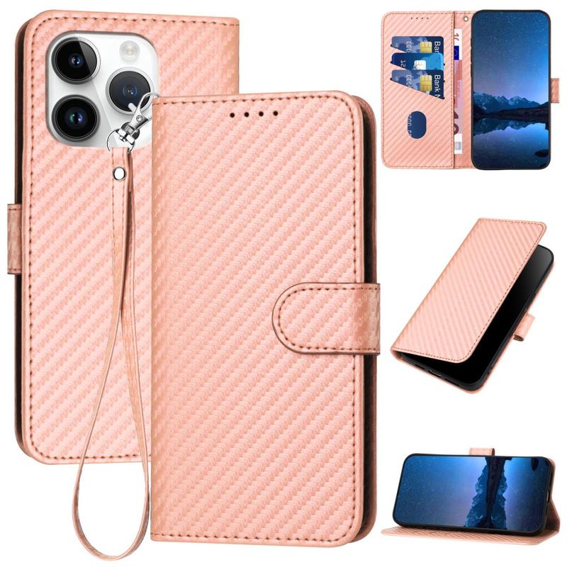 Etui portefeuille premium iPhone 15 Pro Max avec sangle - Texture fibre de carbone - Rose carbone
