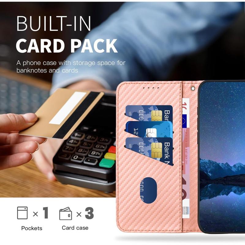 Cet étui portefeuille offre un design élégant, une protection fiable et une utilisation intelligente. La finition texturée en fibre de carbone ajoute un aspect moderne et professionnel, tandis que la couche intérieure en TPU absorbe les chocs en cas de chute accidentelle. Doté d'une fonctionnalité mains libres et d'une sangle amovible, il est conçu pour le confort et la polyvalence.