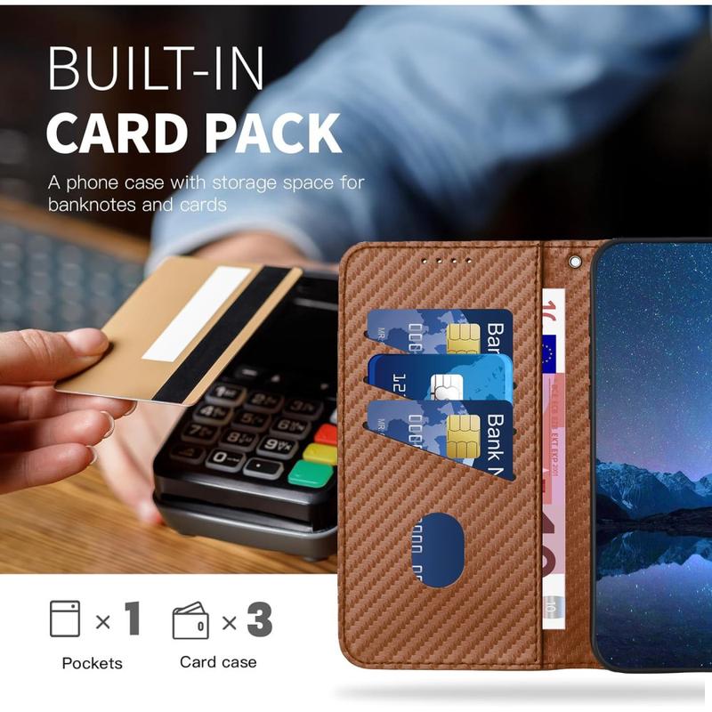 Protégez votre iPhone 15 Pro Max avec style grâce à l'étui portefeuille haut de gamme, conçu avec une texture en fibre de carbone haut de gamme pour un look élégant et moderne. Alliant fonctionnalité, confort et protection fiable, c'est le compagnon quotidien idéal pour les utilisateurs qui apprécient à la fois l'aspect pratique et l'élégance.