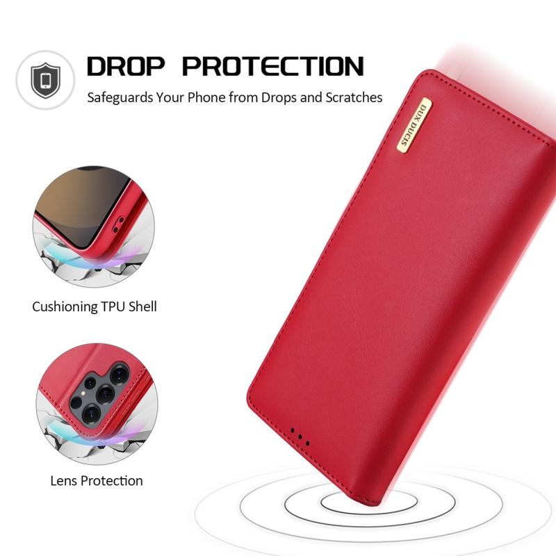 Améliorez la protection de votre précieux Samsung Galaxy S26 Ultra avec cet étui portefeuille en cuir Dux Ducis Hivo ! Équipé de quelques fentes pour cartes et d'un compartiment à monnaie, il remplacera efficacement votre portefeuille et protégera les informations de votre carte de crédit contre le vol. Fabriqué en cuir véritable de haute qualité et en TPU, il se fera sûrement remarquer.