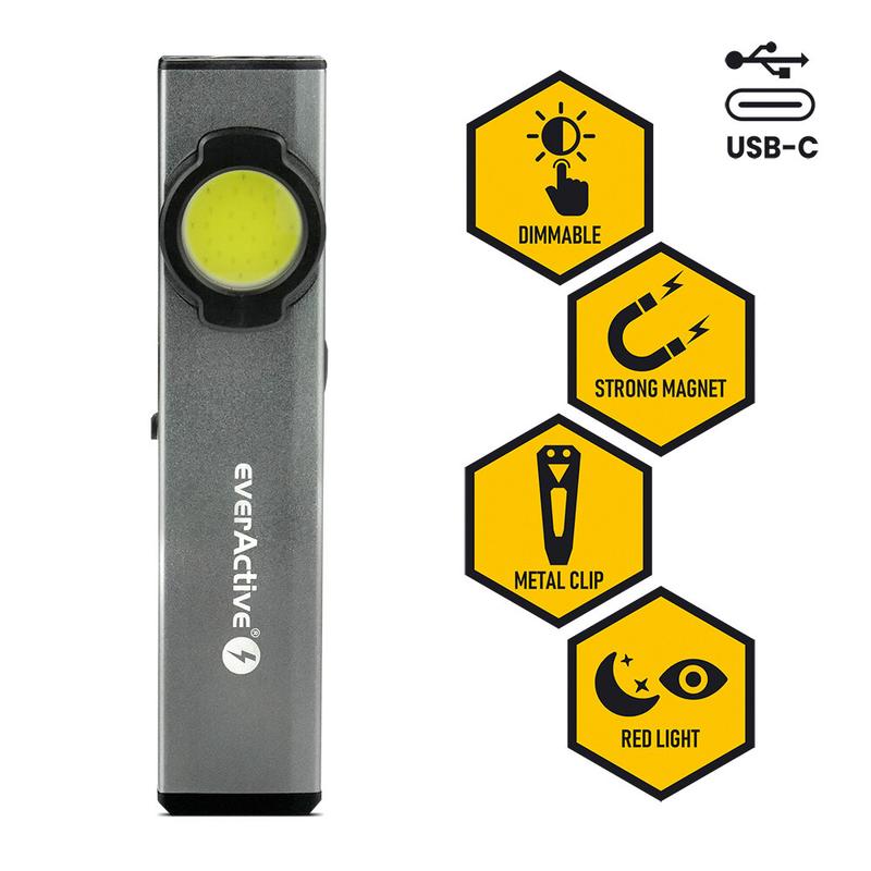 EverActive WL-250R Lampe de poche d'atelier LED rechargeable - 300 lumens, 4 modes, base magnétique et clip