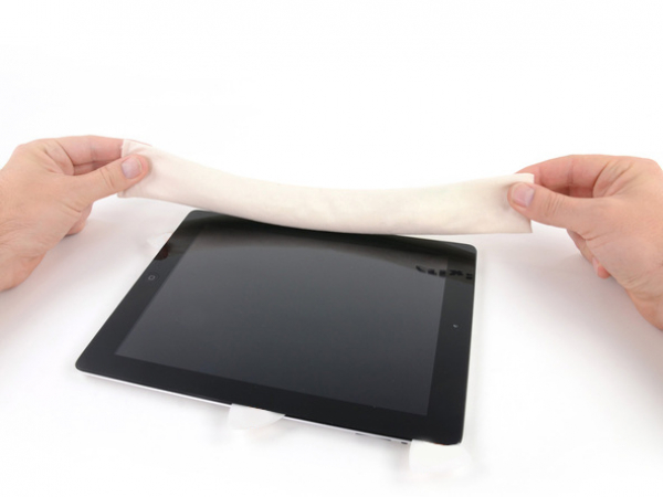 Une partie de l'adhésif le long du périmètre de l'iPad aurait pu se recoller. Si c'est le cas, faire glisser le médiator sous le bord de l'iPad où la vitre avant est toujours collée et "couper" l'adhésif.