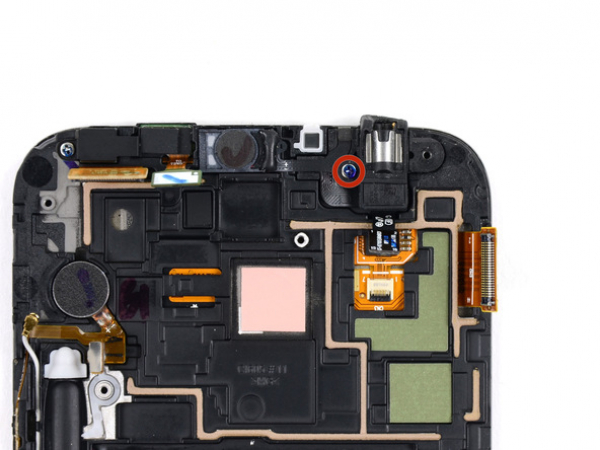 Une vis Phillips (3 mm) fixe l'assemblage de prise casque à l'assemblage d'affichage. Retirez-le.