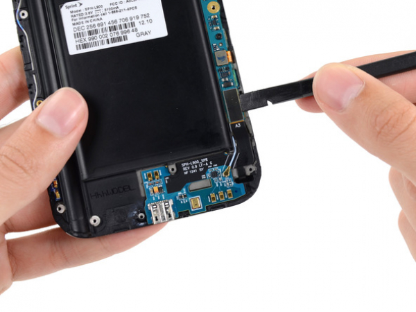 • Utilisez un outil d'ouverture en plastique pour soulever la batterie de la coque. Vous devez insérer l'outil dans le creux au-dessus de la batterie pour le faire.