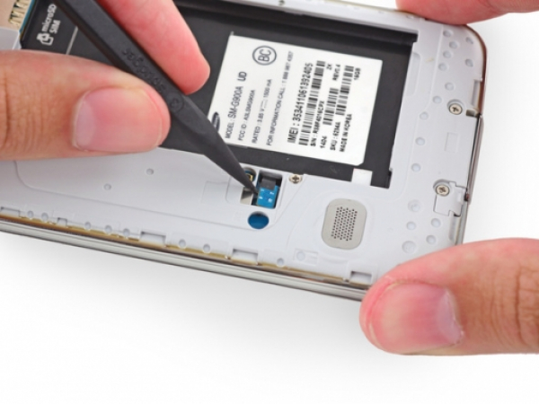 Il y a une bande d'adhésif étroite au-dessus du haut-parleur d'oreille qui fixe le haut du téléphone. Déplacez le médiator le long du haut du haut-parleur d'oreille afin d'éviter d'endommager les composants internes.