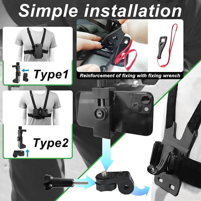 Un support de poitrine pratique, stable et polyvalent qui permet de filmer à la fois avec un téléphone et une caméra d'action, avec un ajustement réglable et des angles de vue flexibles, idéal pour le cyclisme, la randonnée, le ski, les voyages, etc.