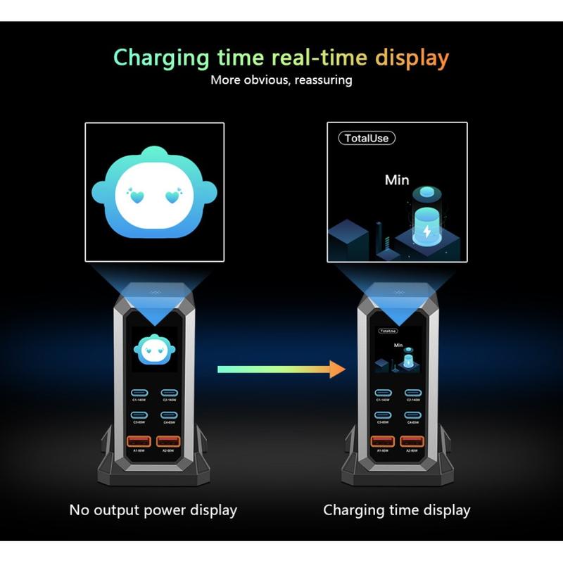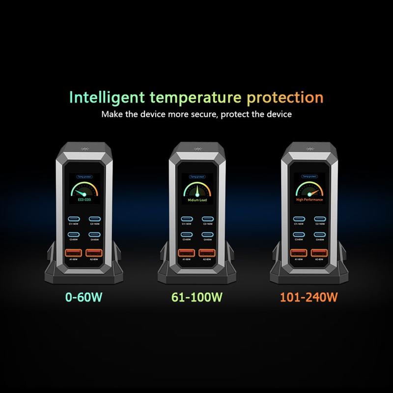 Station de charge USB-C à 6 ports HHW 240W GaN - Hub de charge rapide PD3.1 avec affichage couleur en temps réel