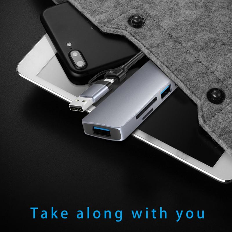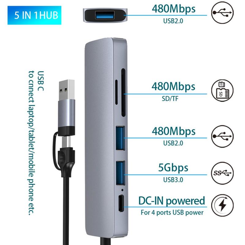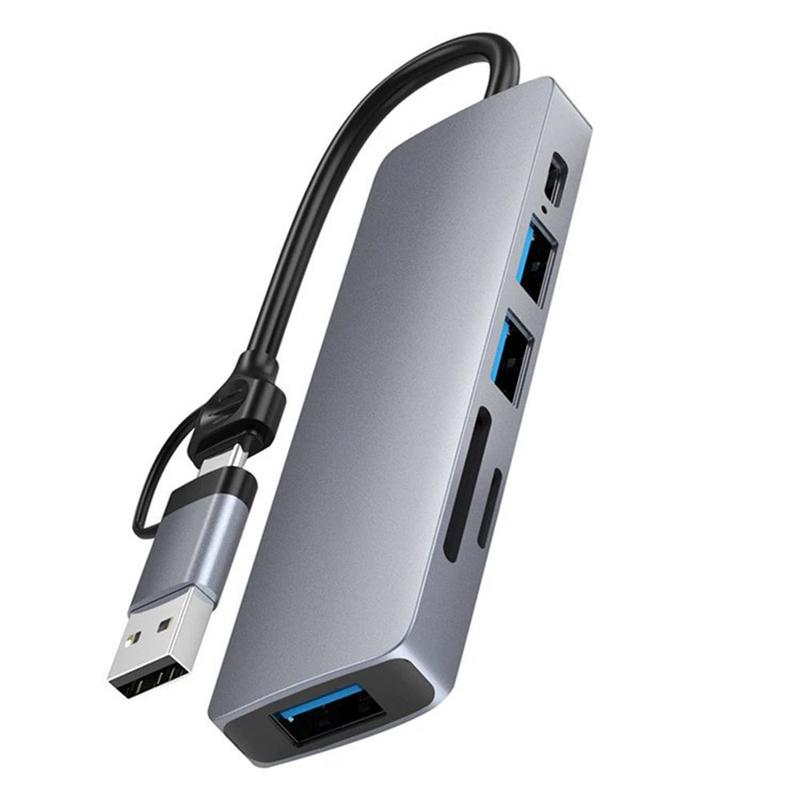 Concentrateur multiport HC-13FL USB-C/USB-A avec un port USB 3.0, deux ports USB 2.0, un emplacement pour cartes SD/TF et un port de recharge USB-C