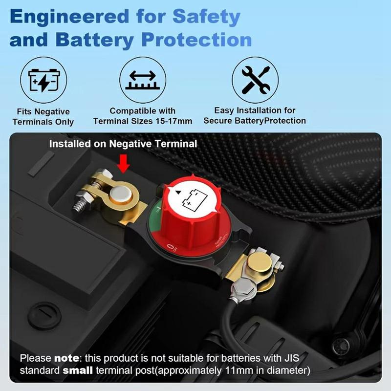 Ce coupe-batterie principal est une mise à niveau intelligente pour tous ceux qui recherchent un moyen simple, efficace et fiable de gérer l'alimentation de la batterie. Il aide à protéger la batterie lorsque le véhicule est stationné pendant de longues périodes, favorise un entretien plus sûr et peut également servir de point de coupure d'urgence rapide. Grâce à sa capacité de courant élevée et à son fonctionnement simple, il convient aussi bien aux véhicules de tous les jours qu'aux applications plus exigeantes.
