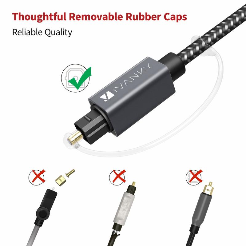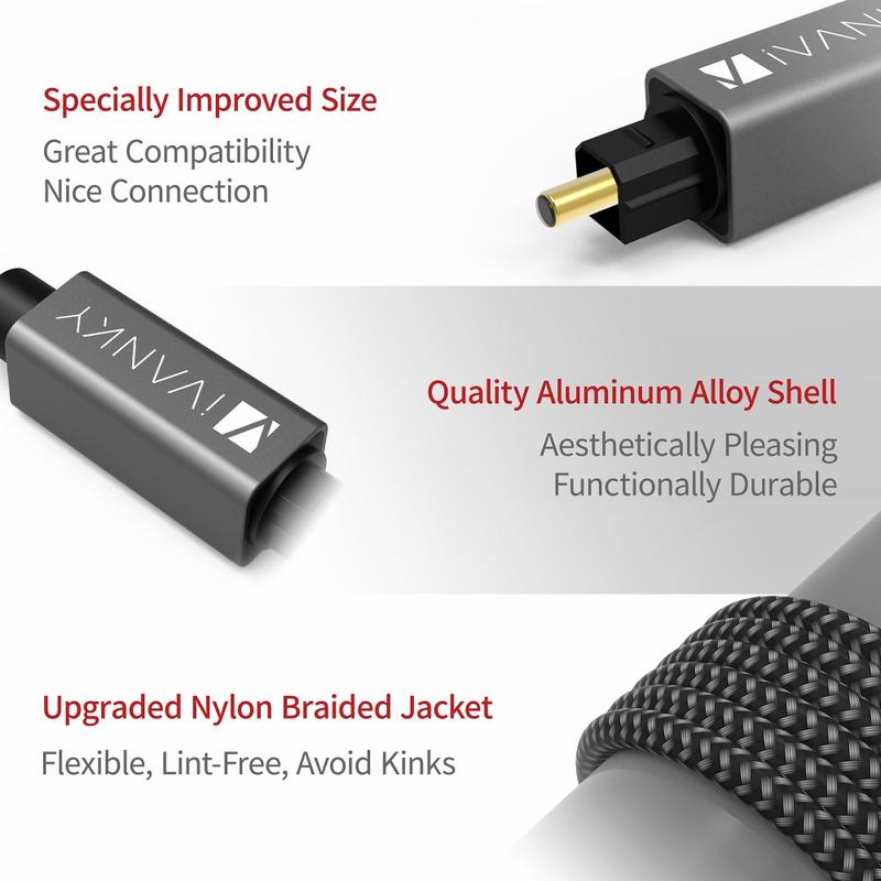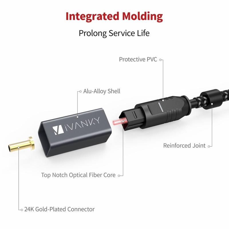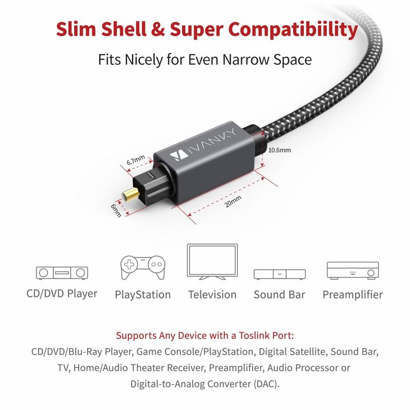 Profitez d'un son propre et sans interférence grâce au câble audio optique Toslink IVANKY OC03. Conçu pour une transmission audio numérique fiable, ce câble à fibre optique de 3 m est idéal pour connecter un téléviseur à une barre de son, un récepteur AV, un système de home cinéma ou une console de jeu. La coque mince du connecteur s'adapte parfaitement aux espaces restreints, tandis que le boîtier en alliage d'aluminium offre une grande durabilité pour une utilisation quotidienne. Une gaine flexible en nylon tressé permet d'éviter les enchevêtrements et les plis, et les capuchons en caoutchouc amovibles inclus protègent les connecteurs lorsque le câble n'est pas utilisé. Il suffit de le brancher pour obtenir une connexion solide et stable et un son numérique d'une grande netteté.