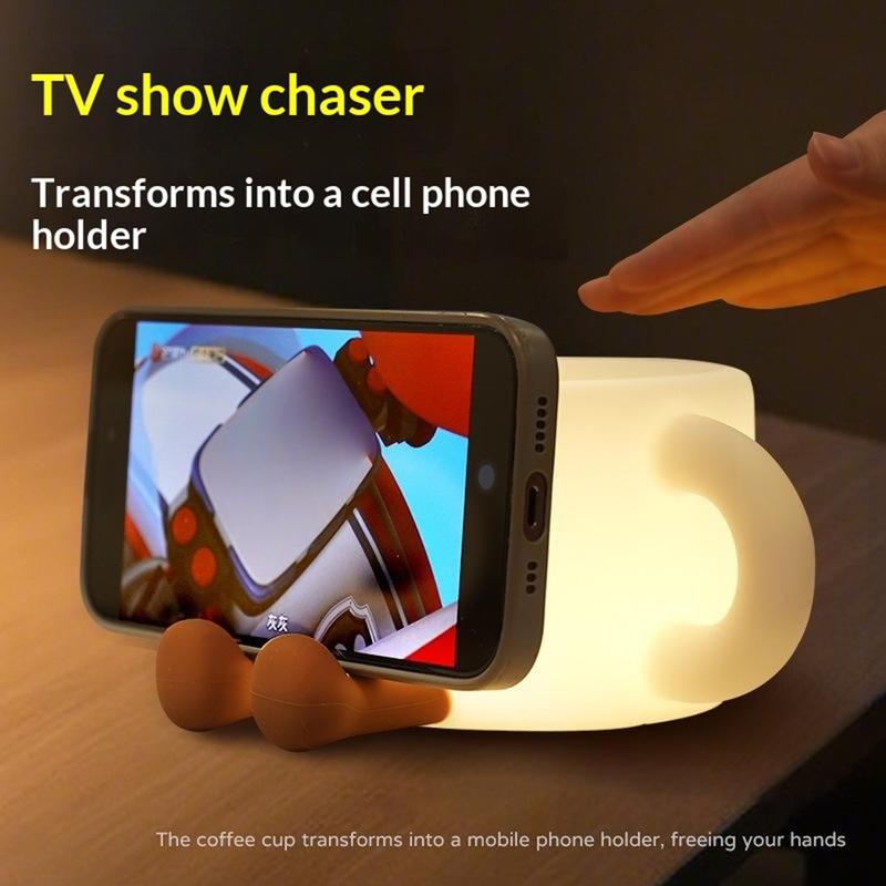 Jolie veilleuse en forme de tasse à café avec support pour téléphone - Lampe LED à 7 couleurs avec commande tactile, 3 niveaux de luminosité chaude, minuterie de 30 minutes, rechargeable via USB-C