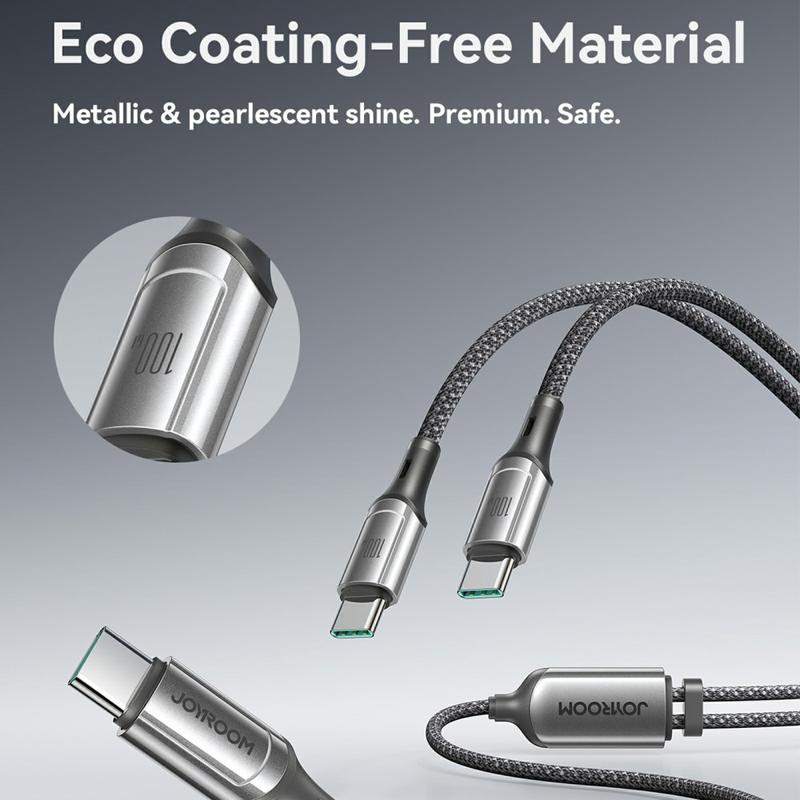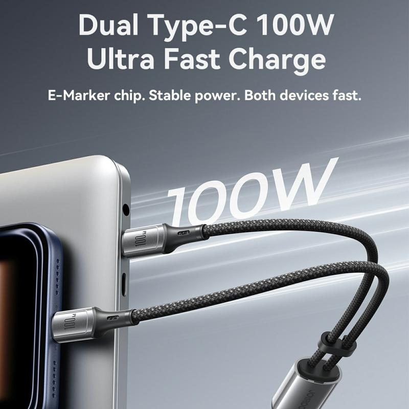 Chargez deux appareils USB-C en même temps avec le câble JOYROOM S-A57 USB-C vers double USB-C. Conçu pour les ordinateurs portables, les tablettes et les smartphones modernes, il prend en charge la charge rapide jusqu'à 100 W et utilise une puce de gestion intelligente E-Marker pour aider à fournir une alimentation stable aux appareils compatibles. Vous bénéficiez également d'un transfert de données de 480 Mbps pour la synchronisation au quotidien, de sorte qu'un seul câble couvre à la fois la charge et les transferts de fichiers. Le câble tressé en nylon durable à 48 brins est conçu pour résister à l'abrasion et aux flexions quotidiennes, tandis que l'attache d'organisation du câble incluse permet de garder votre installation bien rangée sur votre bureau ou dans votre sac. Avec des caractéristiques de durabilité testées telles que plus de 10 000 insertions et une capacité de charge de 7 kg, il est conçu pour une utilisation fréquente.