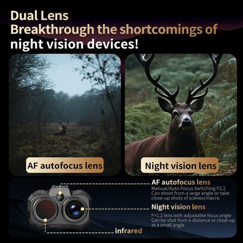 - Technologie à double objectif : Combine un objectif de vision nocturne à longue focale et un objectif grand angle AF pour les prises de vue à courte et longue distance.
