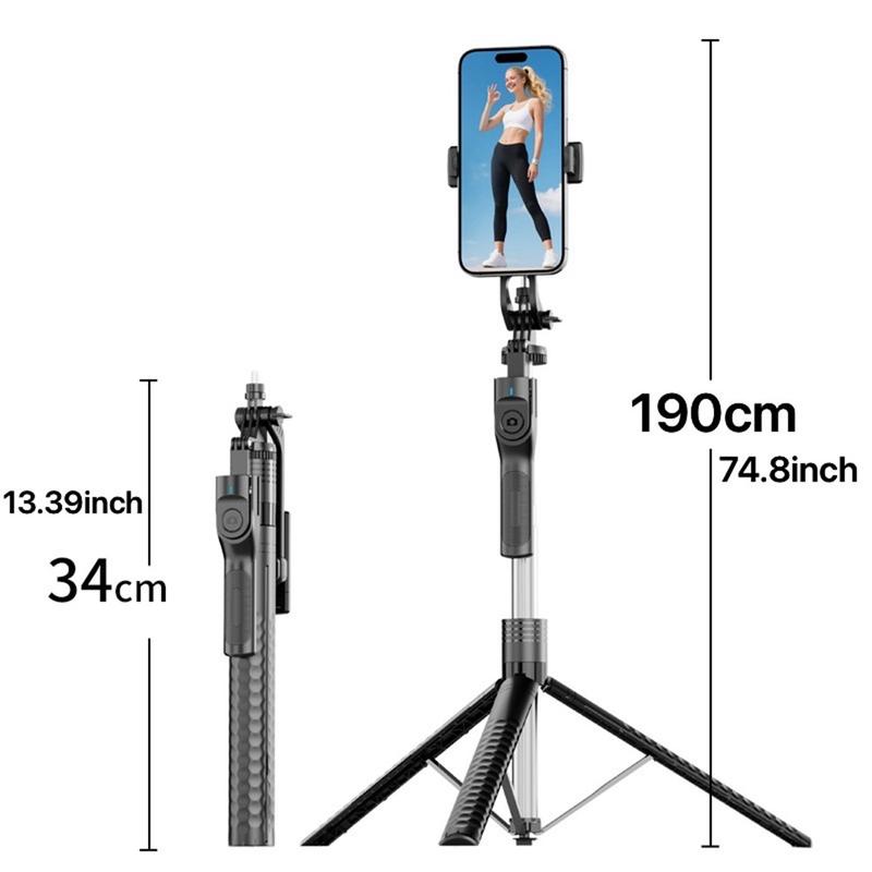 - Conception polyvalente 2 en 1 : Utilisez-le comme bâton à selfie ou trépied, extensible jusqu'à 190 cm pour les photos de groupe, les vlogs et les enregistrements aériens.