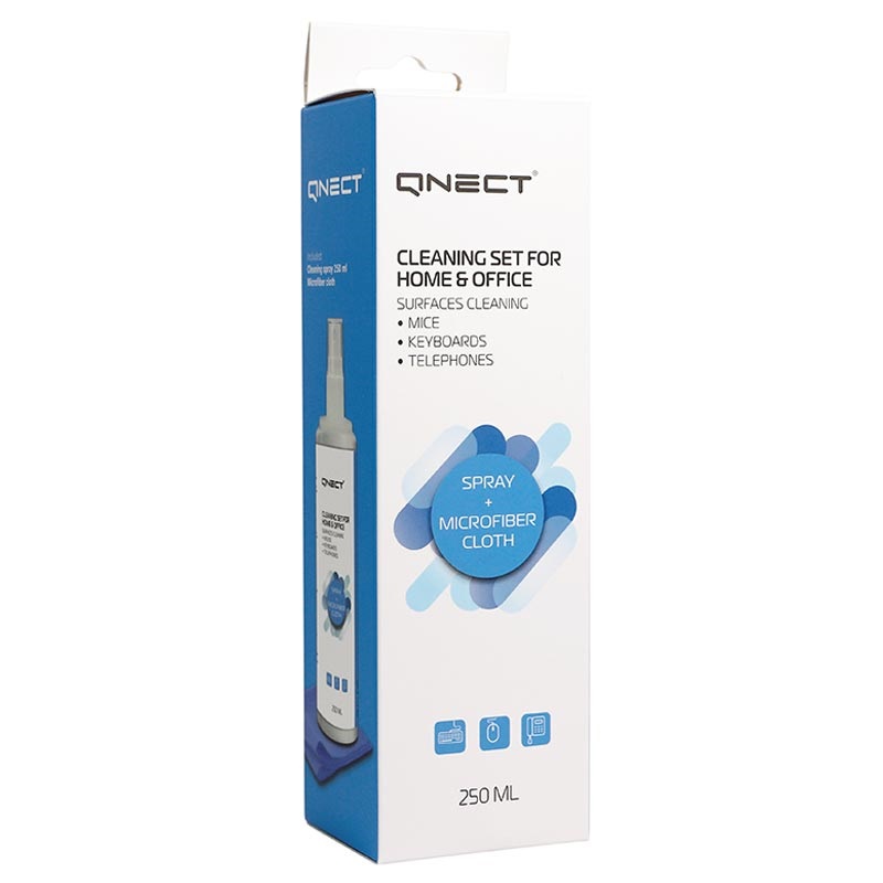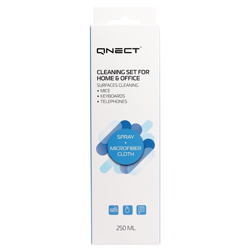 - Ce set de nettoyage Qnect combine un chiffon doux et un spray désinfectant de 250ml