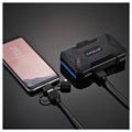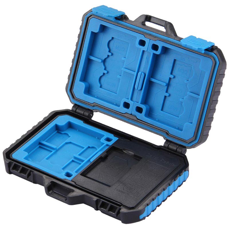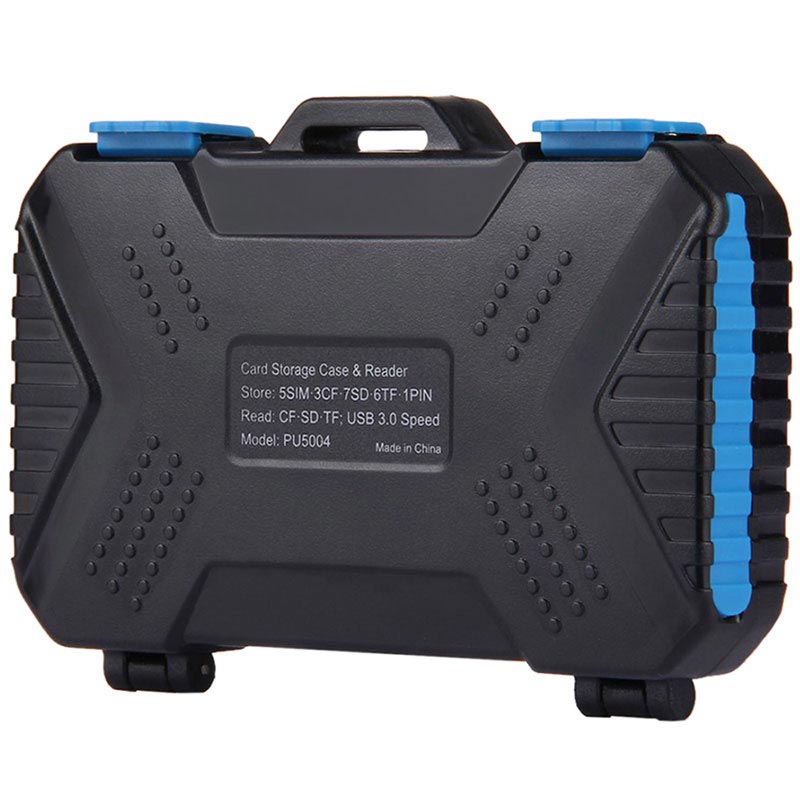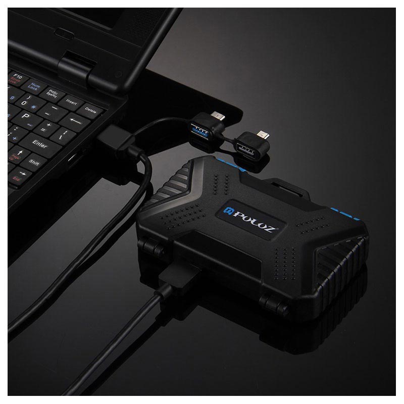 Un lecteur de carte et un boîtier de stockage - ce Puluz PU5004 vous permet de transporter jusqu'à 22 cartes SIM et cartes mémoire différentes et de les connecter à votre smartphone, tablette, PC ou ordinateur portable compatible OTG. Son design léger et compact vous permet de le transporter avec vous et d'avoir toutes vos cartes et votre lecteur à portée de main. Fait en plastique robuste, résistant à l'usure et à l'eau, le boîtier protège vos cartes de tout dommage. Il est fourni avec un câble microUSB 3.0 vers USB 3.0 doté d'adaptateurs microUSB et Type-C.
