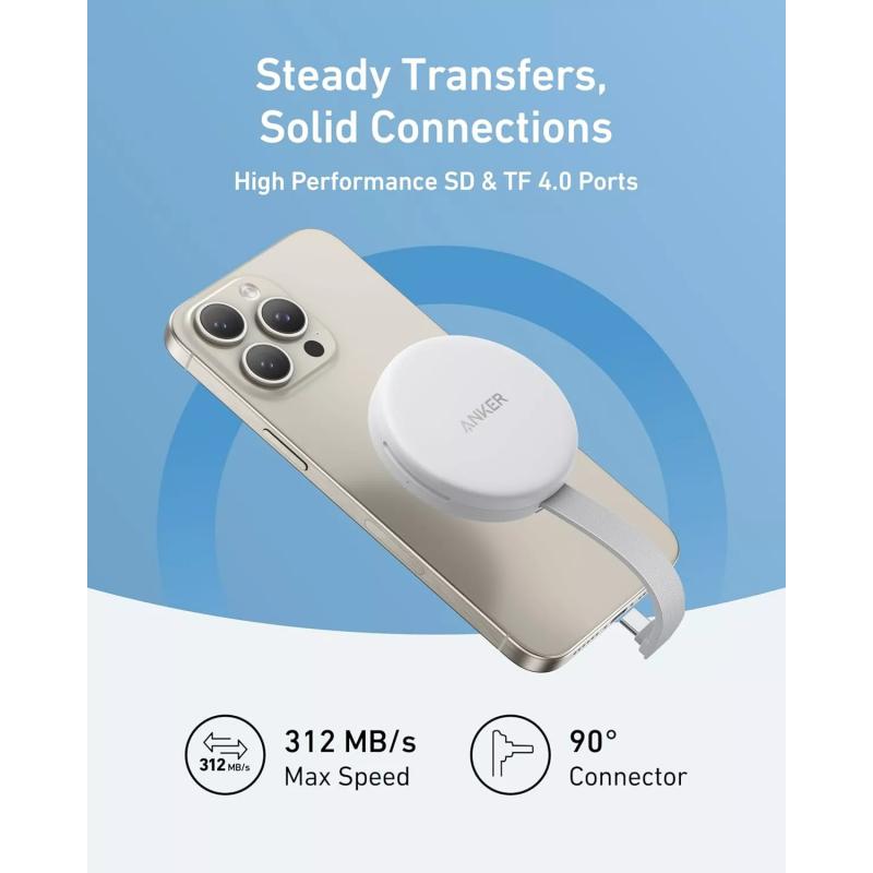 L'adaptateur USB-C Anker MagGo est un lecteur de carte magnétique portable conçu pour un transfert de données rapide et un flux de travail fluide sur les iPhone USB-C. Conçu pour les appareils iPhone 15 et 16, il vous permet de lire des cartes mémoire SD et TF à grande vitesse tout en rechargeant votre téléphone. Avec son design compact, son câble intégré et sa fixation magnétique, il est idéal pour les créateurs qui souhaitent passer rapidement de la capture de contenu à l'édition sans interruption.