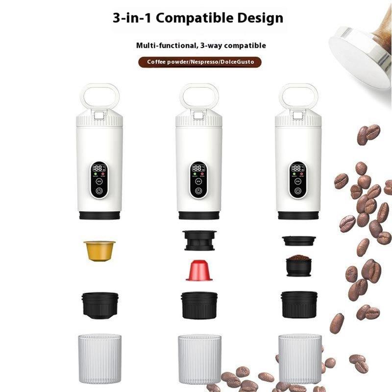 Machine à espresso portable 3-en-1 - Cafetière électrique sans fil à capsules avec batterie 7500mAh pour la voiture, la maison et l'extérieur - Compatible avec les capsules Nespresso, DolceGusto et le café en poudre