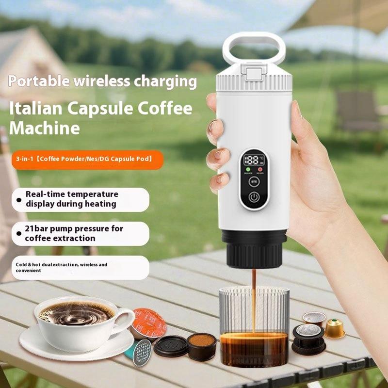 • Machine à espresso portable 3-en-1 - Cafetière électrique sans fil à capsules avec batterie 7500mAh pour la voiture, la maison et l'extérieur - Compatible avec les capsules Nespresso, DolceGusto et le café en poudre
