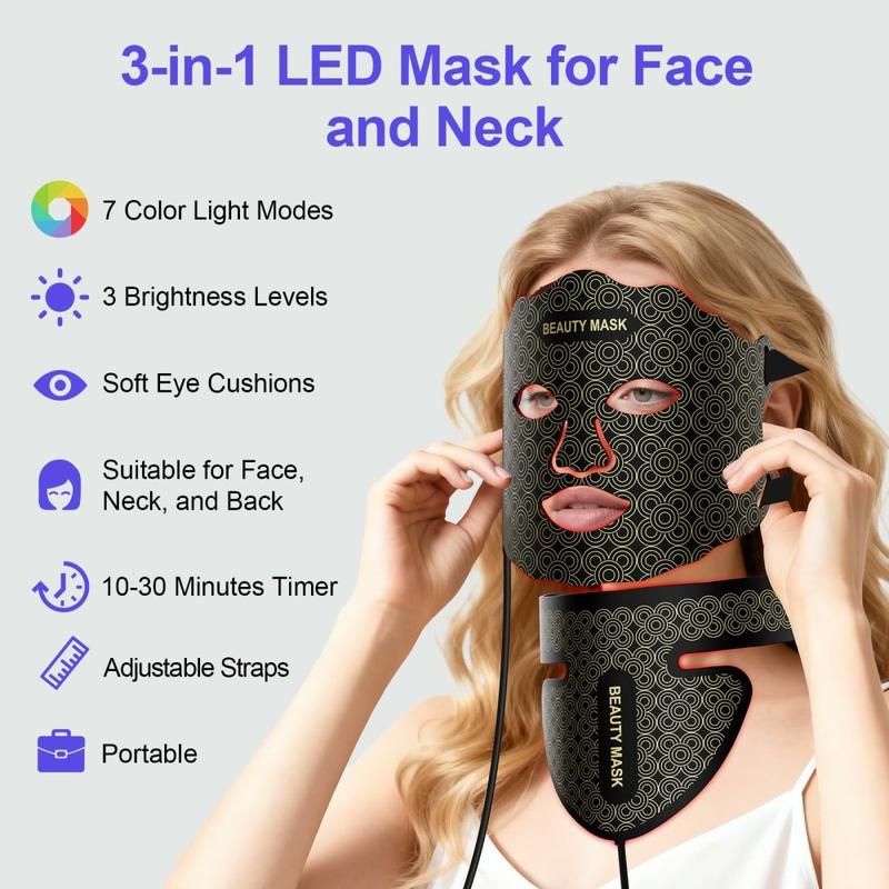 • Masque de beauté à luminothérapie LED 7 couleurs – Appareil de rajeunissement de la peau du visage et du cou avec 3 niveaux d'intensité
