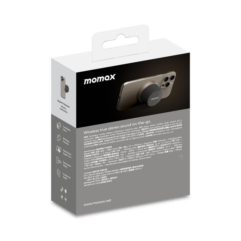La mini enceinte Bluetooth magnétique MOMAX 1-Vibe Go BS6 est une solution audio compacte et polyvalente conçue pour le divertissement quotidien à la maison ou en déplacement. Son design magnétique ultra-mini combine une enceinte sans fil portable avec un support pratique pour téléphone, vous permettant de profiter facilement de votre musique, de vos vidéos et de vos appels. Équipée d'unun puissant haut-parleur de 40 mm et d'unune sortie sonore à 360°, elle offre un son immersif dans un format étonnamment petit, tandis que sa résistance à 'eau IPX6 la rend adaptée à une utilisation quotidienne dans différents environnements.