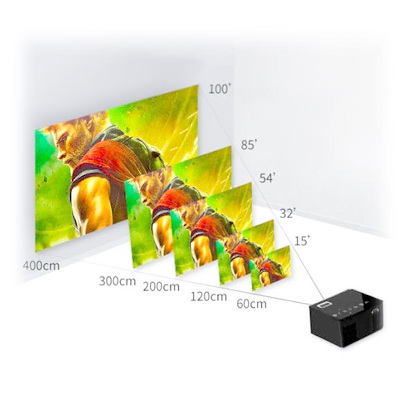 Le mini projecteur LED T200 offre une luminosité maximale de 600 lumens. Pour de meilleurs résultats, utilisez-le dans un environnement sombre. La distance de projection est comprise entre 60cm et 4m et la taille de l’image varie entre 16" et 110". Ce projecteur pratique possède également des boutons pour un contrôle tactile facile, ou vous pouvez utiliser la télécommande fournie. Pas besoin d'enceintes externes, car le projecteur T200 est doté d'un haut-parleur intégré de 2W offrant un son de qualité.