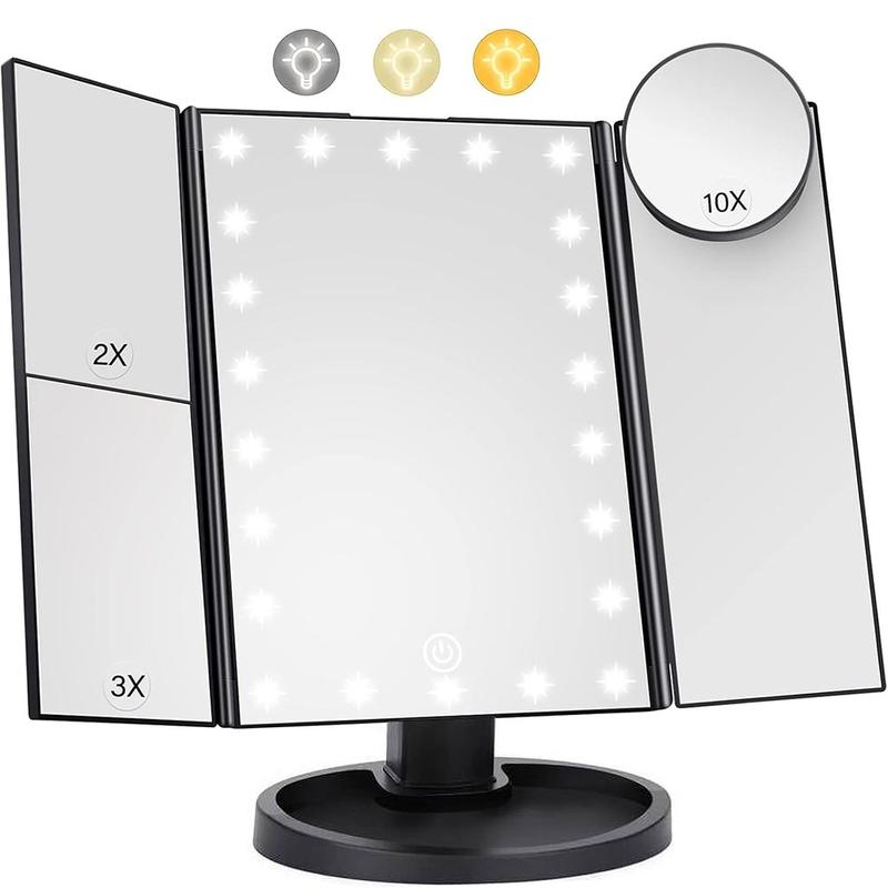 Miroir de maquillage pliable sur 3 côtés avec 22 lumières LED - Miroir de courtoisie grossissant 1X/2X/3X/10X