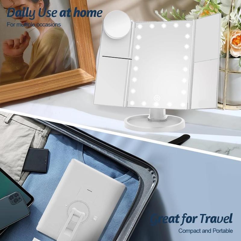 • Miroir de maquillage pliable sur 3 côtés avec 22 lumières LED - Miroir de courtoisie grossissant 1X/2X/3X/10X