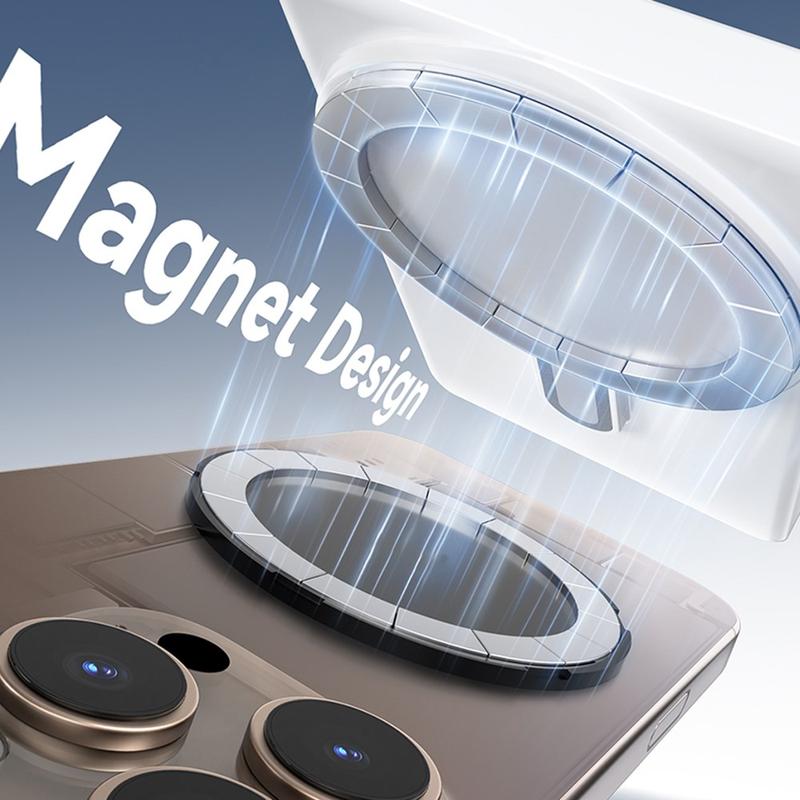 Le support magnétique intégré permet une fixation rapide et sûre à votre téléphone à l'aide du disque métallique inclus. Parfait pour les prises de vue à main levée, les trépieds, les gimbals ou les configurations d'enregistrement sur table.