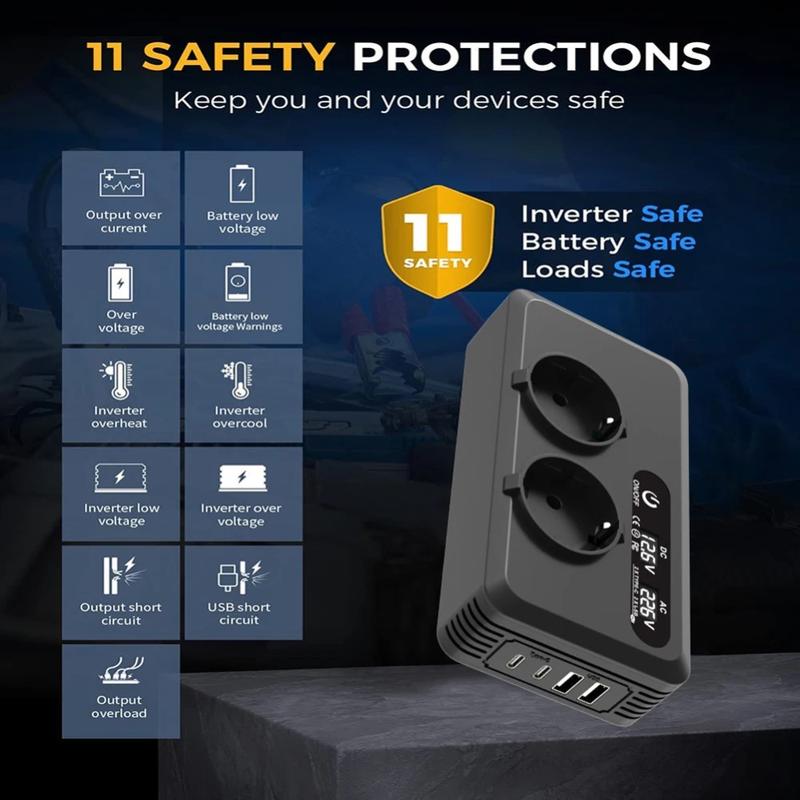 - Rendement et performance élevés - Offre un rendement de conversion de plus de 90 % avec une sortie sinusoïdale modifiée, garantissant une alimentation stable et sûre pour la plupart des appareils ménagers et numériques.
