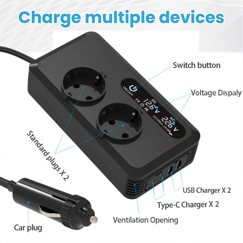 Restez alimenté où que vous alliez grâce à l'onduleur de voiture 200W, votre solution fiable sur la route pour convertir l'alimentation 12V DC du véhicule en 220V AC. Doté de deux prises européennes et de plusieurs ports de charge rapide, ce convertisseur compact est parfait pour alimenter les ordinateurs portables, les téléphones, les tablettes et les petits appareils électroniques en voyage, en camping ou en cas d'urgence.