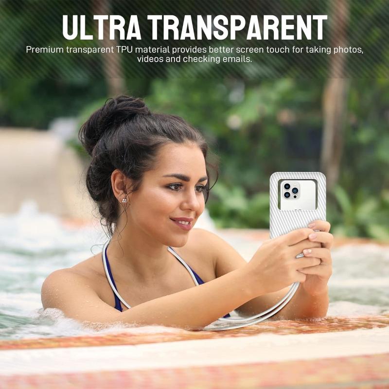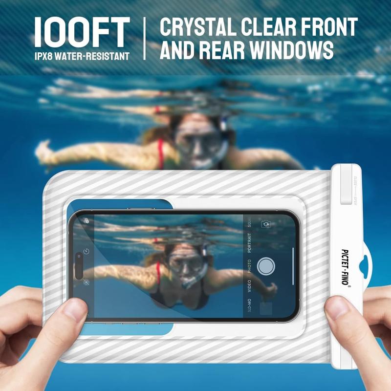 Sac étanche pour téléphone portable certifié IPX8, testé par des professionnels, sans fuite ni dommage à une profondeur de 30 mètres (100 pieds) sous l'eau.