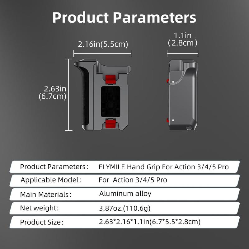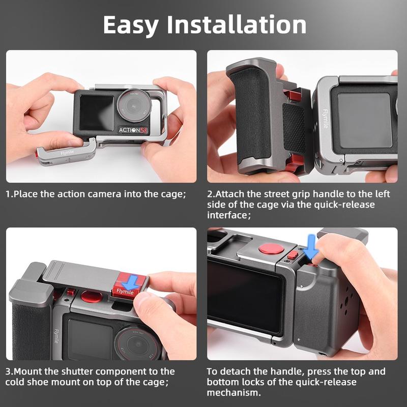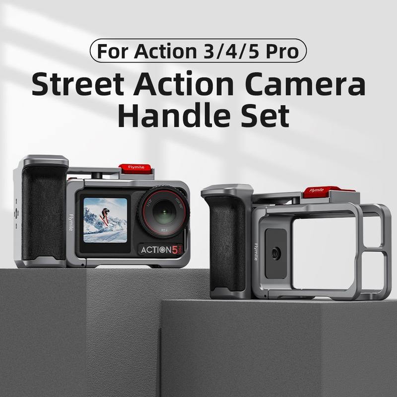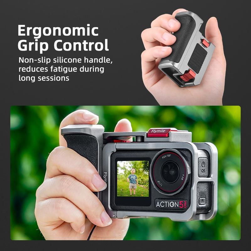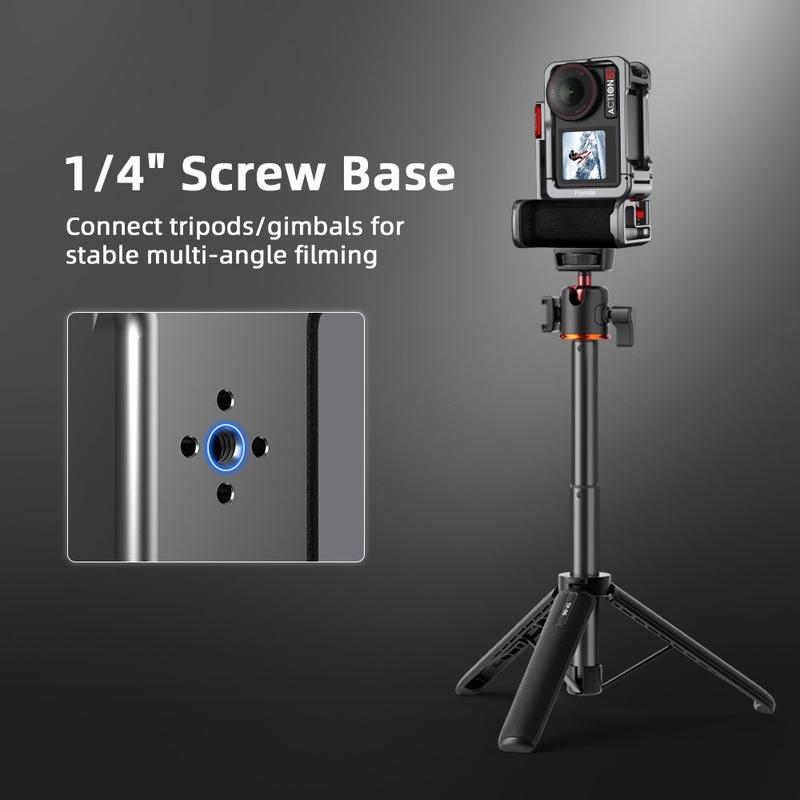 La poignée et la cage Flymile offrent une protection, un confort et des possibilités d'extension supplémentaires dans une configuration compacte, parfaite pour les créateurs qui recherchent un équipement DJI Osmo Action plus stable et polyvalent pour les prises de vue en extérieur et à main levée.