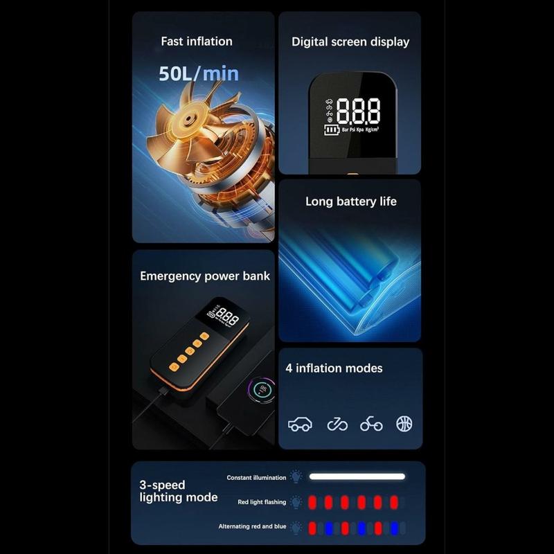 - Gonflage rapide : Le moteur haute performance gonfle les pneus en seulement 6 minutes, avec un débit d'air de 17L/min.