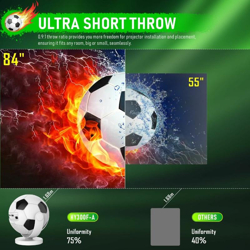 Profitez des plaisirs du grand écran dans les petits espaces grâce au projecteur portable HY300F en forme de ballon de football. Doté d'un design unique inspiré du football, ce projecteur intelligent et compact allie un style ludique à des fonctionnalités pratiques pour le divertissement à domicile. Que vous souhaitiez regarder des films en streaming, suivre des événements sportifs en direct, profiter de séries ou projeter du contenu sur le mur ou le plafond de votre chambre, ce modèle vous offre un moyen simple et flexible de créer une expérience visuelle plus immersive chez vous.