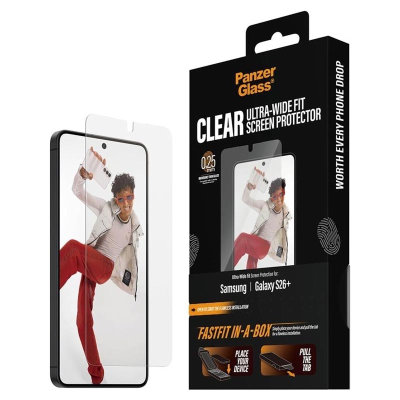 Protection d'écran en verre trempé PanzerGlass Ultra-Wide Fit avec FastFit In-A-Box pour Samsung Galaxy S26+ - 9H