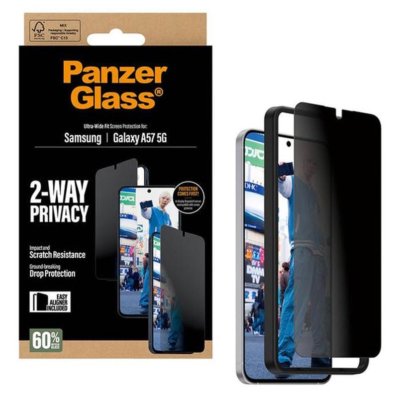 - Le protecteur d'écran PanzerGlass Ultra-Wide Fit Privacy EasyAligner n'est PAS compatible avec le capteur d'empreintes digitales Samsung Galaxy A57