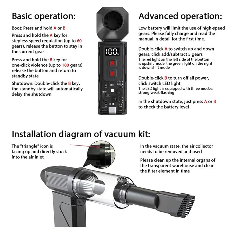 • Puissant aspirateur 2 en 1 avec souffleur turbo et aspirateur à main - 13.000 tr/min, 100 niveaux de vitesse, batterie 8 000 mAh