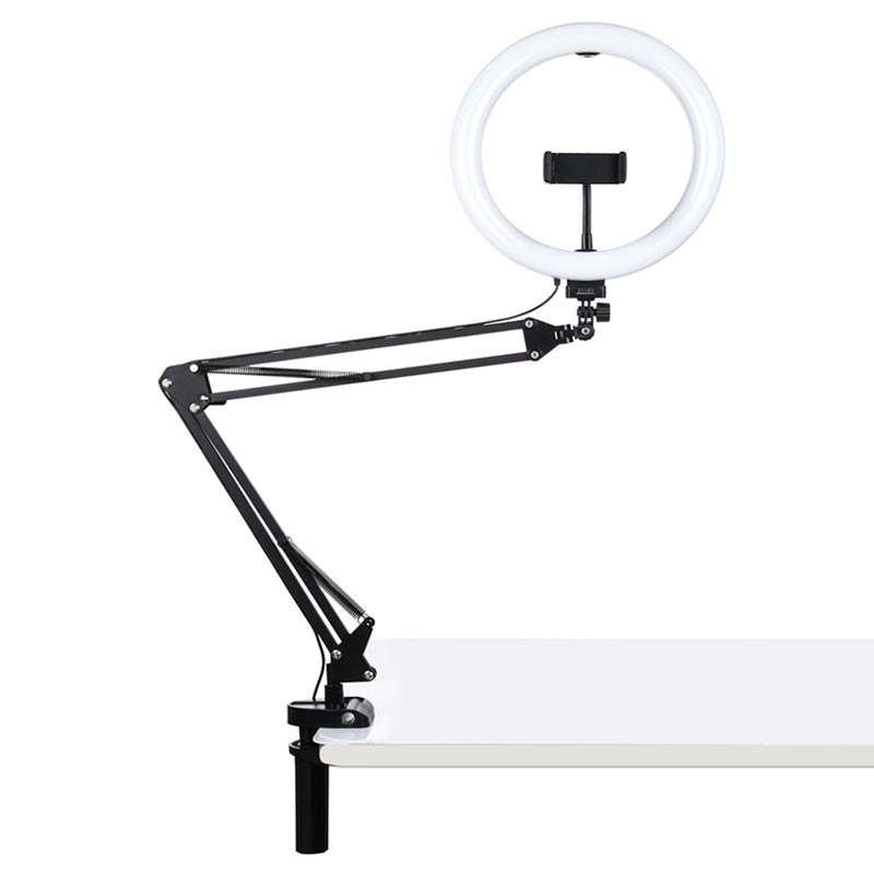 PULUZ 10.2" 26cm Ring Curved Light + Desktop Arm Stand USB 3 Modes Dimmable Dual Color Temperature LED Vlogging Selfie Photography Video Lights with Phone Clamp