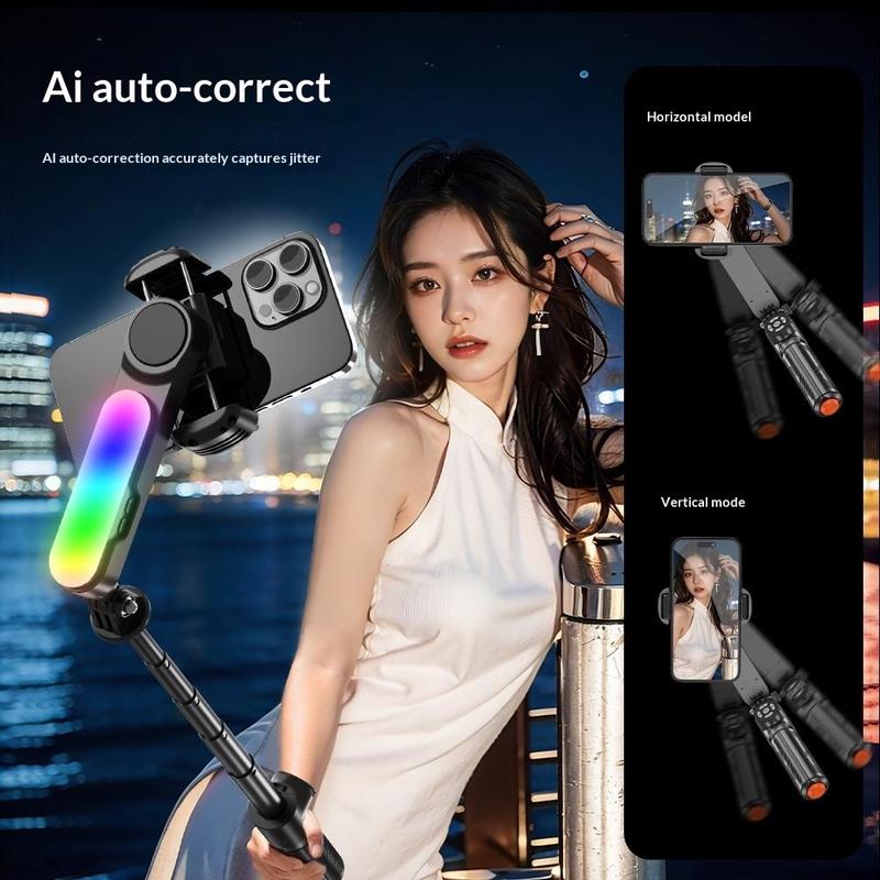 Stabilisateur à cardan pour selfie Q34 AI Anti-Shake - Support pour téléphone extensible jusqu'à 71 cm avec éclairage de beauté RGB et télécommande