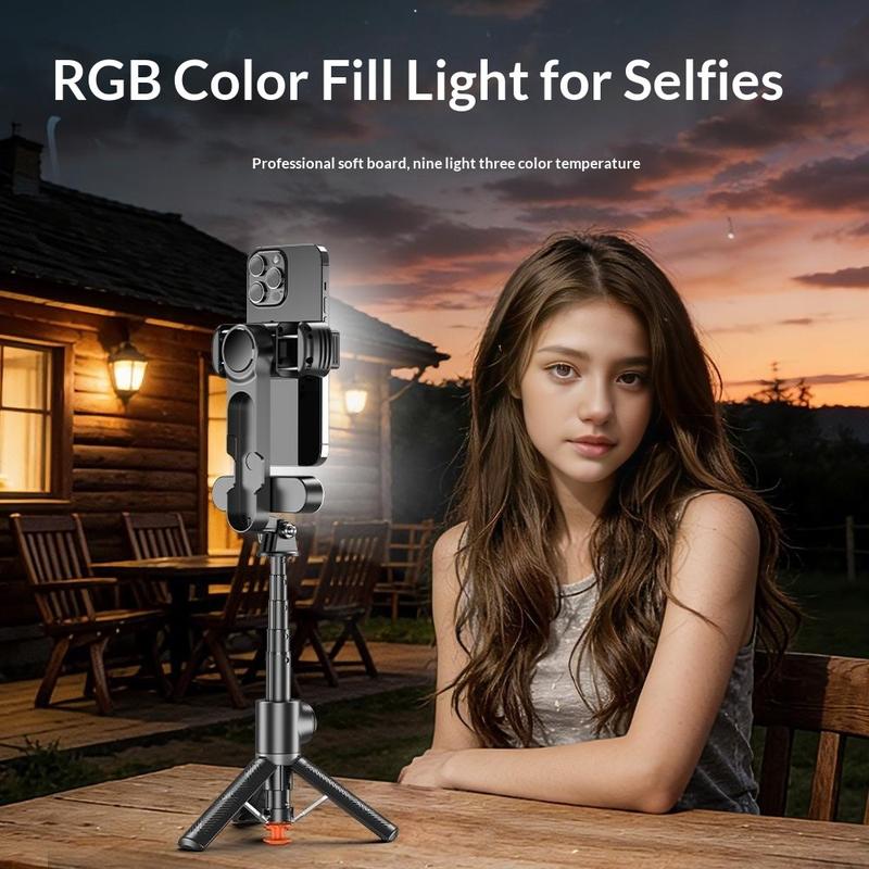 Une lampe de beauté RVB intégrée offre une flexibilité d'éclairage supplémentaire pour les selfies, le streaming et l'enregistrement en intérieur. Selon les informations fournies, elle propose 9 niveaux de luminosité, 3 températures de couleur et plusieurs modes de couleur avec des effets de flash. La télécommande Bluetooth 5.2 incluse permet une utilisation sans fil jusqu'à 10 m, ce qui rend la prise de photos et de vidéos plus pratique. Compact, rechargeable et multifonctionnel, le Q34 est un choix pratique pour les utilisateurs qui souhaitent bénéficier d'un meilleur support pour la prise de vue avec leur téléphone dans un seul accessoire.