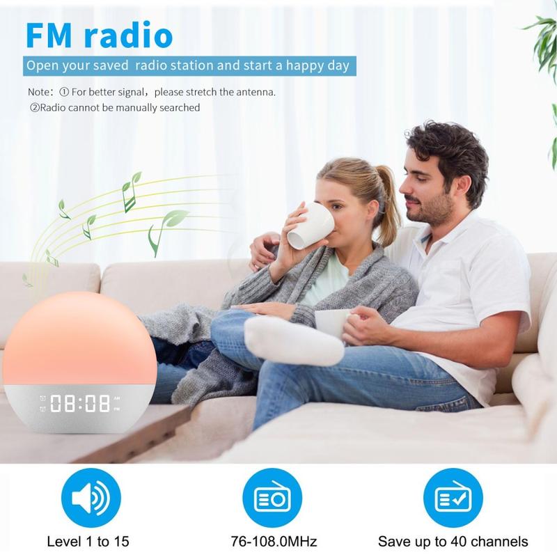 Réveillez-vous plus naturellement et endormez-vous plus paisiblement grâce au réveil lumineux LED de chevet SH08. Cette lampe de chevet multifonctionnelle combine un réveil simulant le lever du soleil, une veilleuse d'ambiance, un générateur de bruit blanc, une aide au sommeil et une radio FM dans un seul appareil compact. Elle est conçue pour rendre vos matins et vos soirées plus agréables, que vous recherchiez un réveil en douceur, une atmosphère plus calme au moment du coucher ou un éclairage d'ambiance tamisé pour votre chambre.