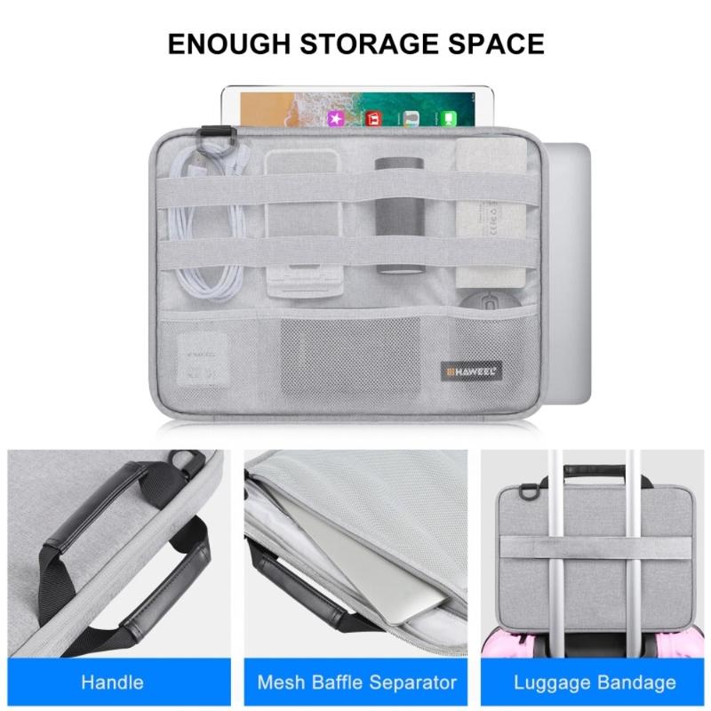 Transportez votre ordinateur portable en toute sécurité et voyagez plus intelligemment avec la sacoche HAWEEL HWL2168 pour MacBook. Conçue pour les ordinateurs portables de 14 à 15 pouces, cette housse de protection fine combine un rembourrage multicouche et un compartiment pratique pour accessoires, afin que vous puissiez ranger tous vos essentiels au même endroit. L'extérieur en polyester imperméable protège contre la pluie et les éclaboussures, tandis que la doublure intérieure douce réduit le risque de rayures lors de vos trajets quotidiens, au bureau et en voyage.