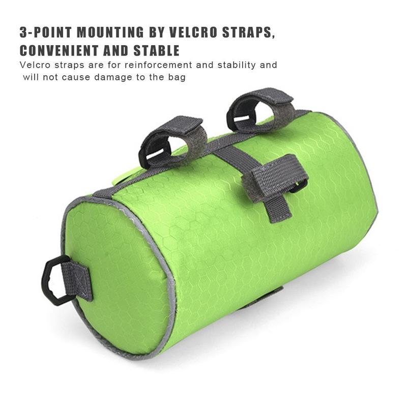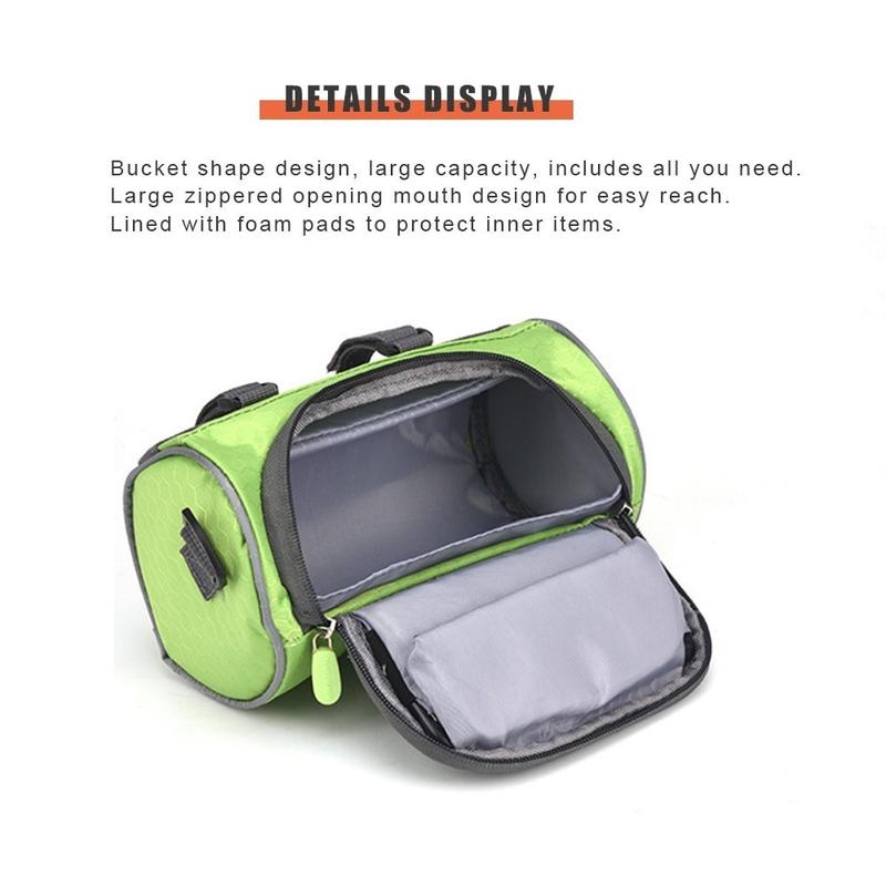 Cette sacoche de guidon est fabriquée en polyester imperméable + PVC souple, facile à essuyer et à nettoyer. L'ensemble de la sacoche est rempli de mousse, ce qui permet non seulement de protéger les articles internes, mais aussi de conserver la forme du cylindre.